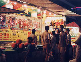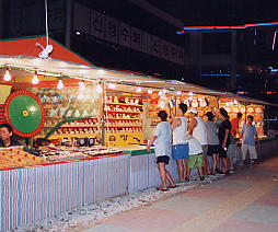 さて、おなかもいっぱいになって皆で車に乗り、アパートまで戻ります。食事代は全部部屋貸しのご主人持ち……太っ腹であります!感謝!!部屋貸しのご家族は、今晩は私たちに部屋を貸して親戚の人のところに行くそうです。私たちは部屋貸しのご家族、kuniさんとも別れてから、まだまだ賑やかな夜の束草の海水浴場に行ってみました。海水浴場はとにかく人が多く、屋台も色々出ていました。テキ屋みたいな屋台もあって、野球の球を投げるタイプやバスケットボールを使うものなど、なかなかユニークなものもあって、面白かったです。浜辺に出てみても多くの人がくつろいでいました。