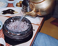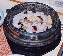 束草の話、韓国の食べ物の話、そして金剛山や白頭山の話などで盛り上がる中、石の器に入ったトルソッパプが現れます。もち米の中になつめや豆や朝鮮人参が入った、とっても健康的に見える食べ物です!口に入れてみます……なつめの仄かな甘味が嬉しい、素朴なる美味であります!!たちまちのうちに食べ尽くし、最後に石にこびりついた“おこげ”にお湯をかけ、お粥のようにしていただきます。これもまた香ばしく、美味でありました!