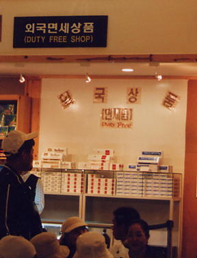 さて、ホテル海金剛に帰るまで、バスを待つ温井閣は大混雑です。温井閣には開設を認めるかどうかで韓国内でもめた、“免税店”がありました。問題の免税店は駅のタバコ屋さんくらいの規模で、洋酒とタバコしか商品はありません。客も金剛山のみやげ物屋に較べ少ないようです。本当にこんな免税店を開設することをめぐって、ああでもないこうでもないともめたのでしょうか?