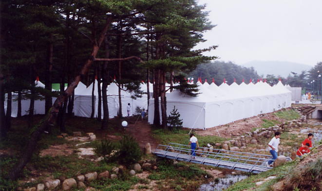 金剛山温泉隣のテント村、子どもたちがキャンプ体験をする。