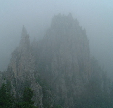 岩の壁の間を進む道を登りきると、どうやら頂上近くに着いたようです。実は頂上には3ヵ所展望台があって、いちばん端の展望台に辿り着くまでもう少し頑張らねばならなかったのですが……このときはとりあえず一安心しました。ここは鄭さんからいただいた地図によると『望洋台』という地名らしく、天気が良いと万物相・金剛山の絶景とともに、東海(日本海)を望むことができるところらしいのですが……霧と雨のおかげで、海どころか数十メートル先の岩も見えるかどうか怪しい感じです。しかし時々垣間見える周囲の奇岩の数々からは、さすがに世に名高い名勝の名をはずかしめない風格を感じます。