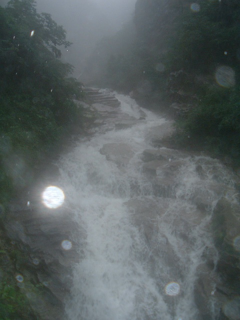 三仙岩を過ぎてまもなく、渓谷の反対側にはそそり立つ岩の壁が見えてきました。しかし霧や雨に巻かれてなかなか全景を望めません。それから少し進んでいくと、今度は切斧岩というやはりそそり立つ岩の壁が見えてきました。切斧岩の少し先の方には、階段状になった滝が望めます。階段状とはいえかなりの落差がある滝です。霧に見え隠れする七層岩も切斧岩も滝も、まさに東洋画の世界で見ごたえがあるのですが、団体行動の行列と強い雨のおかげで、なかなか景色を堪能する余裕がありません(-_-;)。