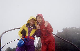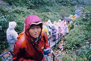 さて、天仙台での眺望を楽しんだら下山です。強い雨は容赦なく降りつけてきます、風も強く、まさに“嵐の万物相”になってしまいました。合羽を着ていても水が中まで染み込んでくるは、靴はずぶ濡れでやはり水が染み出してくるは……もうぼろぼろであります(-_-;)。私たちを含め、皆逃げるように山を降りていきます。それでものりまき・ふとまきは、途中『安心台』という展望台で、日本語が少し出来る、ぽっちゃりした感じの現代の若い女性社員さんに記念撮影のシャッターを押してもらったり、また北朝鮮の環境巡視員と現代の若い男性社員の人が一緒にいるところを見つけて、話し掛けてみたりもしました。人の良さそうな北朝鮮の女性環境巡視員さんは、にこやかに私たちアンニョンハシムニカ」と、応えてくれます。ところで、北朝鮮の環境巡視員と一緒にいた若い現代社員はサッカーが好きなようで、私たちにJリーグの韓国選手の話題を話しかけてきました。