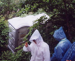 どのくらい登ったでしょうか?雨と急坂で時計を見る余裕もありません……目の前に突然簡易トイレが現れました。こんなところまで簡易トイレを運んでくるとは……ご苦労様です。簡易トイレの後は、これまでの道よりも比較的ゆるやかになりましたが、まだまだ登りが続きます。私たちの周りを歩く韓国人の皆さんも登山に専念です……