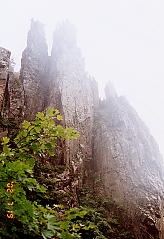 仕方ありません、先へと進むことにします。この頃には雨ばかりではなく風も出てきました。周囲の景色は良いのですが、もはや写真撮影は思うにまかせません……そしてしばらく進んでいくと、突然目の前に屏風を立てたような岩の壁が二枚、現れました。道はその岩の壁の間をよじ登るようにつけられています……合羽を着ているとはいえ、強い雨のおかげで身体はかなり濡れてきました。気温もかなり低いようで、山登りをしている最中とはいえ、身体はなかなか暖まりません。少しづつ身体が硬くなっていくような感じがしてきたと思ったら、この急登です。