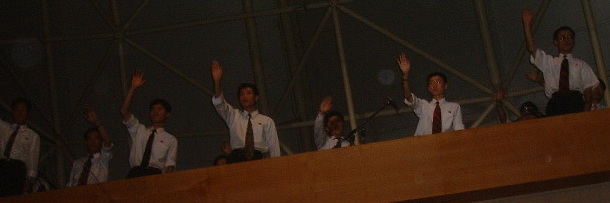 サーカスが始まりました。オーケストラの『金正日将軍の歌』生演奏の中、まず最初に出演者が壇上に整列して、ご挨拶です。このあたりは前回と全く同じです。演目も多くは前回と同じでしたが、出演者は違っていたような気がします。このところ公演回数が増えているのでしょうか?演技の切れが、全体的に前回よりも鈍いような気がしました。特に最後の空中ブランコでは、演技の途中で一人の男性が失敗して落下してしまったら、なんとそのまま演技そのものが“終了”となってしまいました。前回は落ちても落ちても再挑戦したのに……そして、尻切れトンボの終了でバツが悪そうな顔をしていた空中ブランコ団員たちに、舞台の奧の方からサーカス団の団長とおぼしき恰幅のよい中年男性が、激しく観客席の方を指差しながら、『ちゃんとお客様に挨拶をしろ!!』といった感じの指示を飛ばしているのを見ました。それを見た空中ブランコ団員たちは、あわてて観客たちにきっちりと礼をします。どこの世の職場にもありそうな光景を見て、のりまきはなんとなく少しほっとしたような感じがしました。