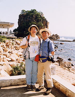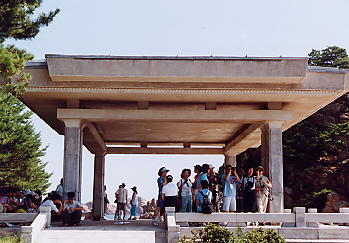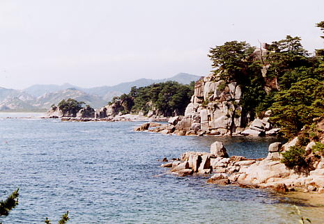 海金剛は青い空、青い海、そして松の緑が夏の好天のもと輝いて見えました!。雨上がりのせいか、夏にしては空気も澄んでいるようで遠くの方までくっきりと見えます。韓国人の観光客の何人かが韓国側を指差して、『統一展望台(トンイルチョンマンデ)』と言っていましたので、そちらの方角を見てみると、たしかにそれらしいものが見えます。