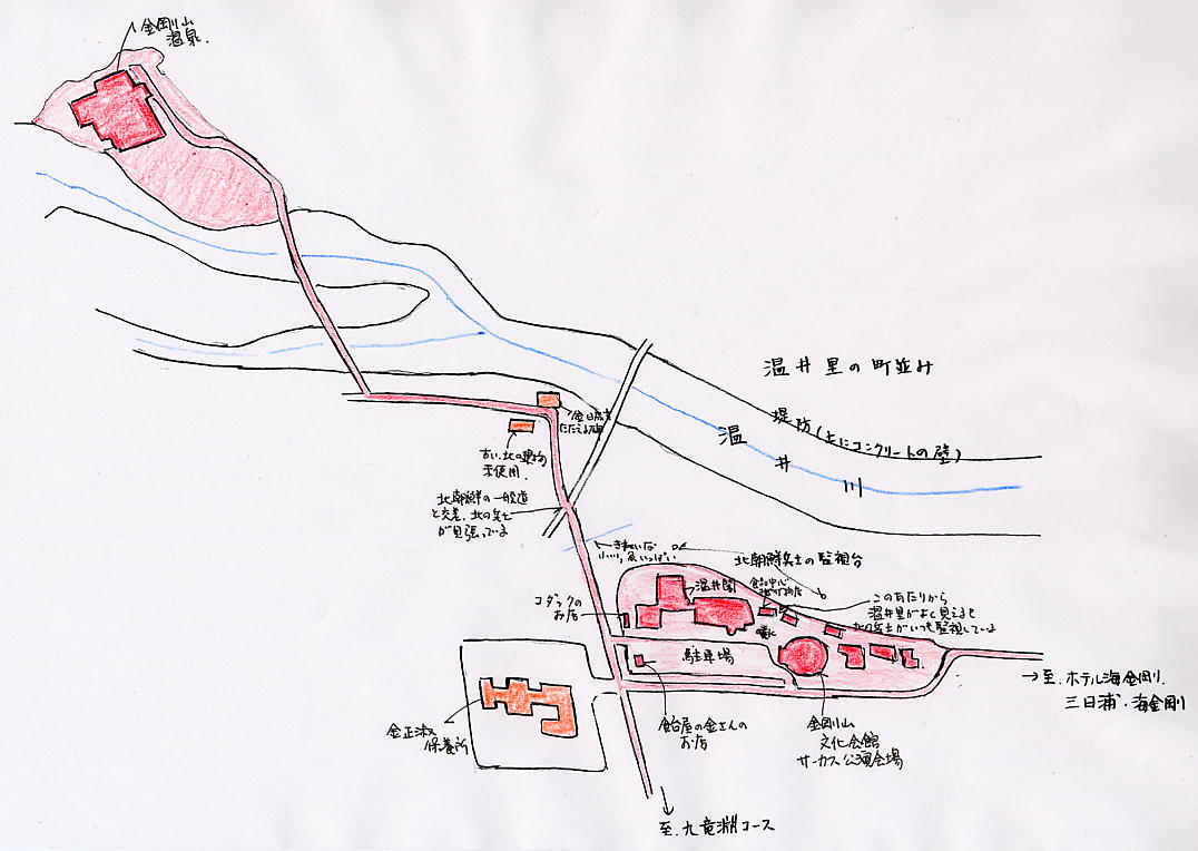 赤く色づけした部分が現代グループ観光施設、オレンジ色は北朝鮮の建物です。