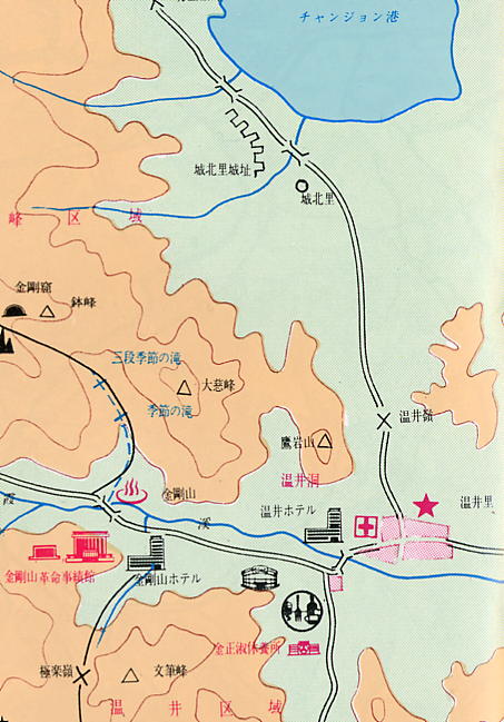 1939年の温井里はいったいどうなってしまったのでしょうか?1995年の地図を見る限り、以前の温井里があったあたりには『金剛山ホテル』と『金剛山革命事績館』があることがわかります。2002年の金剛山旅行の際、金剛山ホテル(金剛山旅館)のそばを通りましたが、どうも松林の中に保養所などが立ち並んでいるのみで、民家らしい建物は確認出来ませんでした。