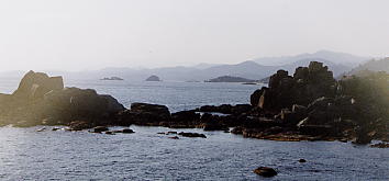 統一安保公園先にもしばらく人家はあり、スルメなどのおみやげ物屋や、海水浴場などもありました。しかし、そのうち民統線(民間人統制線の略、民統線の先は民間人の立ち入りが制限される)の検問ゲートの先は、全く人家がなくなり、あるのは空と海と海岸線、あとは軍事施設と鉄条網だけになりました。そのうちバスの行く先彼方の海に、青い空のもと、青い海に多くの島が浮かぶ絶景が広がりはじめました。今まで見てきた景色の何倍も何倍も美しい、目の覚めるような絶景です。間違いありません、憧れの海金剛です。