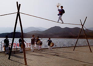 バスが着いた場所から運転手さんが指差した方向へ歩いていくと、結構大きな湖のほとりに出ました。花津浦(ファジンポ)です。先ほど見た海金剛の絶景と対照的に、あまり多くはないとはいえ観光施設が立ち並ぶ、少々俗っぽい場所です。湖水もにごっています。金剛山(海金剛)の南の端というには少々役不足かなあ……と思いながら歩いていると、なにやらどんちゃかどんちゃか鐘や太鼓の音が聞こえてきました。『なにやっているんだろう?』と思いながら近づいてみると、湖畔の広場で韓国の民俗衣装をまとった数名の若者が韓国の民俗楽器を演奏し、やはり民俗衣装をまとった一人の若者が、地上数メートル上に張られた綱の上に立っております。彼らの後ろにある宣伝文を、のりまきの乏しい韓国語の知識で解読してみると、どうやら6月半ばから12月末まで毎日(!)、14:00〜15:00の間、彼らはこの場所で韓国民俗風のパフォーマンスを行なっているようなのです。天気が良かったとはいえ平日の昼間、観客は2〜3名しかいません。おりしも山の方から冷たい風が吹いてきます。綱の上の若者は強風をものともせず、果敢に綱渡りにチャレンジ。だんだん調子に乗ってきたか、綱の上で飛んでみたり跳ねてみたり……結構楽しめました。