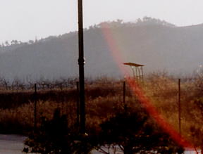 観光施設や道路と、外界を隔てている金網と北朝鮮兵士が見張りに立つ台。