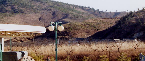 まもなく道は右方向にカーブを切ります。進行方向右側に、大きな青いプレハブ造りの建物が見えるあたりで、北朝鮮の一般道と金剛山観光専用道路が交差するところがありました。さすがに道路が交差する場所は金網もありませんでしたが、かわりに北朝鮮の軍人がしっかりと見張っています(-_-;)。どうも北朝鮮の一般の道路利用者の皆さんは、金剛山観光のバスが通過する間、交差地点で待たされていたようです。青いプレハブ造りの建物には『金剛山生水(クムガンサンセンムル)』の文字が見えます。どうやら鳴り物入りで売り出したのに、水の仕入れ価格をめぐる北朝鮮側との対立の結果、事業中止に追い込まれた金剛山ミネラルウォーターの工場のようです。