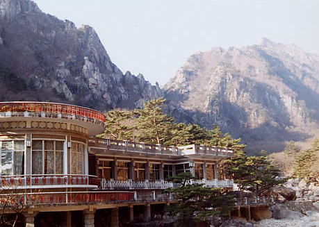 出発するといきなり北朝鮮の宣伝石碑があって笑わせてくれましたが、ほどなく道は川沿いを進むようになりました。大きな石がごろごろころがっている川で、水はとても澄んでいます。周囲の山々の姿もなかなか美しく、空気もとっても美味しいです。そして目の前には北朝鮮が作ったレストラン、木蘭館(モンラン館)が見えています。周りの景色に溶け込んだ、なかなか良いデザインです。しかし全てのカーテンが下ろされていて、この建物は現在使われていないようです。ミス・キムも「今、ここは使っていません」。と説明していました。