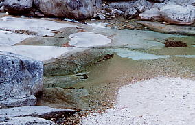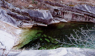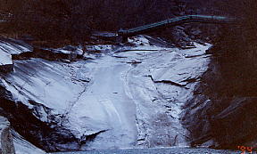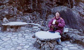 その少し先に自然に出来たトンネル“金剛門”がありました。思ったよりも長いトンネルで、4〜5メートルはあったと思います。金剛門を過ぎると道は次第に坂が目立つようになってきます。山から吹く風も冷たさを増し、そばを流れる川も氷が張っている場所が目立つようになりました。そして深いエメラルドグリーン色をした玉流潭と、長い滑り台のような玉流の滝が見えてきました。玉流潭と玉流の滝の先には鋸の歯のような峰々が見えています。寒さに震えながら、景色の素晴らしさに感動していました。こんな時、コダックのジャンパーを着た人が、美しい景色をバックに、金剛山観光客相手に記念撮影を撮る仕事をしていました。コダックのお店は温井閣の脇、飴屋の金さんのお店近くにあって、写真の現像やフィルムの販売、また金剛山観光客に同行して記念撮影をするなどの仕事をしていました。