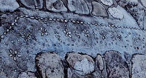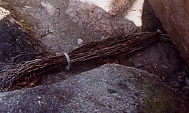 また、監視員の中には竹箒を持っている人もいました。その竹箒は、柄がついていない細い竹を束ねただけの小さなもので、前かがみにならないと掃除はできそうもありません。歩いていくうちに気づいてきたのですが、登山道はだいたい落ち葉がなく、きれいでした。周囲の木々を見るとクヌギやらコナラのような落葉樹も多いので、秋から初冬にかけて結構落ち葉も多いと思います。道をよく見ると、箒で掃いた跡が見えることもありました。どうやら北朝鮮の監視員の皆さんは、例の竹箒を使って登山道の掃除も行なっているようです。また、ところどころに金日成親子を称える文字などが岩に彫り込まれている光景も見えてきました。