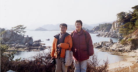さて、この海金剛ではまず昨晩金剛山温泉で『ソウルまで車に乗っていきませんか?』と勧めてくれた恰幅のよい中年男性に再会しました。男性はのりまきが首から下げていた“金剛山観光カード”をしげしげと眺めています(^o^)。のりまきが改めて挨拶をすると、「あ、私は徐○○といいます。こちらが私の母です」。といって、隣にいた母親を紹介してくれました。更にのりまきの隣にいたふとまきについて『どういう関係ですか?』と、極めて単刀直入な質問をしてきます。「あ、妻のふとまきです」。と、こちらも単純明快な回答をします(笑)。「新婚旅行ですか?」徐さんは、続いてそんなことを聞いてきました。「いいえ、違いますよ〜」。と答えると笑っています。そういえば後ほどもう一度徐さんにあった時、徐さんは笑いながら「新婚旅行…いいですねえ……」。などといっておどけていました。また、徐さんはとても好奇心の旺盛な人物らしく、私たちと話した後には、北朝鮮の監視員になにやら色々と質問をしていたようです。