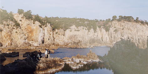 海金剛の観光ルートを進んでいくうちに、突然現代の社員たちがなにやら大声を出しはじめました。九竜淵コースと万物相コースとに分かれた前日と違って、海金剛は金剛山観光客が全員一緒に参加します。約200人の観光客に対し、数人の現代社員が大声で叫んでいるのです。ミス・キムも私たちに対して「あちらの方向の写真撮影は絶対に駄目です」。と、今までにない強い調子で話します。『なんだろう?』と思い、問題の方角を見てみると、約10メートルほどの海辺の断崖の中ほどを一部削って、高射砲やトーチカが据え付けられています。『はは〜ん……これじゃあ確かに写真撮影は出来ないな……』と納得しました。以前日本人の観光客が金剛山観光中に“カメラが軍事基地の方角を向いていた”というだけでカメラごと没収となったといういわくつきの場所は、きっとここでしょう。それにしてもこの軍事基地、さきほど見たものものしい防御線によって仕切られているようなのですが……それほどまでに重要な軍事基地なのでしょうか?温井里から海金剛まで来る途中に見えたアンテナかレーダー基地も、ホテル海金剛そばの軍事基地もそんなに厳重な防御線などありませんでした。日本に帰ってから地図で確認したのですが、私たちが見学した海金剛から南北の軍事境界線まで、直線距離にして6〜7キロの距離はありそうです。海金剛の次に向かった三日浦も軍事境界線から8キロくらいですし、だいたい現代の観光施設のある温井里自体、軍事境界線から15キロ程度ですから、やはり海金剛そばのものものしい防御線は南北の軍事境界線に近いからあるというには疑問が残ります。