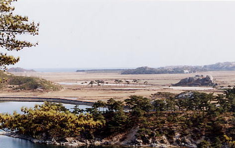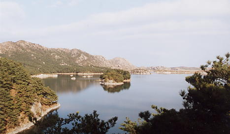 バスを降りるとまもなく展望台がありまして、展望台からは三日浦が一望できます。。展望台の名前は、崔会長が“将軍台”と言うと説明してくれます。三日浦は今回の旅行2日目に見た花津浦と同じく、海の入り江が堆積作用の結果仕切られて出来た潟湖だといいますが(注1)、正直なところ花津浦よりもずっときれいです。穏やかな湖面は天然の鏡のようですし、湖の周囲を囲む山々の、松の緑や岩々が湖面に映え素晴らしい景色です。ところで北朝鮮の農民の皆さんに一所懸命手を振っていた若者は、三日浦の絶景には目もくれず、将軍台に建っていた金正日氏の母親、金正淑氏をたたえる石碑の写真を撮っていました。