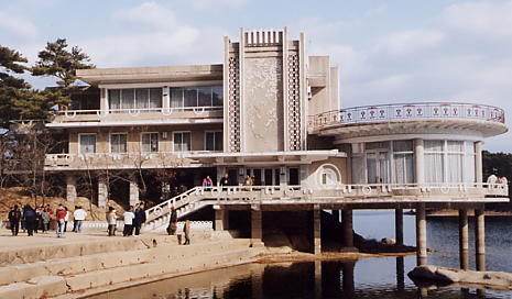坂を降りきってしまうと、先の方に湖畔に建つ瀟洒な建物が見えてきました。建物の近くに行ってみますと、壁面になかなか洒落た紅葉のレリーフがあります。崔会長は再び先ほどガイドしてくれた現代社員を呼びます。現代社員も心得たもので、まず崔会長に韓国語で建物の説明をします。「この建物はタンブン館(丹楓館:注3)といって、北朝鮮のレストランです。現在は使われていません」。とのことです。確かにカーテンは下ろされたままです。「この建物をぐるりと廻って、それから駐車場の方へ向かいます」。崔会長はこう続けました。丹楓館には湖沿いに歩けるようなテラスがあって、そのテラスをぐるりと廻ることができるのです。丹楓館のテラスから湖面を見ると、なぜか丹楓館の周囲の湖底にはいくらかゴミが落ちていました。まあ、ゴミがあるといっても日本の富士五湖などよりもずっときれいですが……そして丹楓館のテラスからは、先ほど蓬莱台から望めた四仙亭を比較的近くから見ることができました。また、丹楓館のそばにはやはり北朝鮮の監視員の人がいまして、何人かの韓国人観光客に囲まれて質問を受けていたようです。