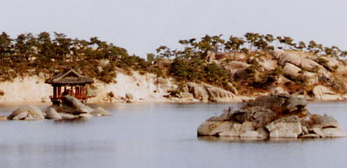 のりまき・ふとまきとも蓬莱台からの景色に見とれていますと、崔会長が現代の男性職員の一人を掴まえて「あんた、ガイドしなさい」。と言いました。現代の男性職員は崔会長と私たちの姿を見て、にこりと笑うとまず、崔会長に対して韓国語で説明をします。崔会長はうんうんと聞いた後、「湖に浮かぶあの島は、牛が寝そべっている形に似ているので、寝た牛の島(臥牛島:ワウド)という。そして湖の中の小さな島に建っている建物は、昔そこで4人の仙人の女……」ここで少し崔会長がいいよどんでいるので、「仙女のことですか?」とのりまきが言うと「そうそう、仙女が天からやってきて、遊んだので四仙亭と言われている」。と通訳してくれます(注2)。崔会長のわかりやすい通訳を、のりまき・ふとまきとも頷きながら聞いているのを見て、崔会長は満足そうに「昨日私と会えばよかったんだ。もっと色々通訳出来たのに……」と言います。ガイドをしてくれた現代の男性社員も嬉しそうです。