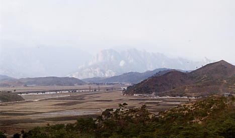 蓮花台から見た北朝鮮の農村風景、遠くに金剛山の勇姿が見えます。